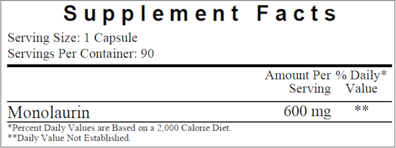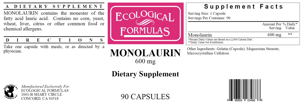 Monolaurin 600 mg by Ecological Formulas is a dietary supplement designed to support a healthy immune system.* The key ingredient is a compound found in human breastmilk, as well as certain vegetable oils. Monolaurin is a fatty acid that has a long history of supporting immune system health, and is extracted from coconut oil for use in this supplement.*