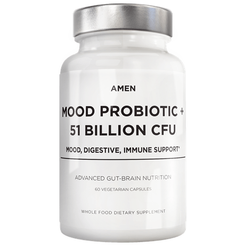 Amen Mood Probiotic features 51 billion CFUs* of probiotics, organic prebiotics, and an organic blend of plants and fruits. The formula provides 15 different probiotic strains including L. acidophilus and L. casei all-in-one and is designed to support the brain-gut axis.