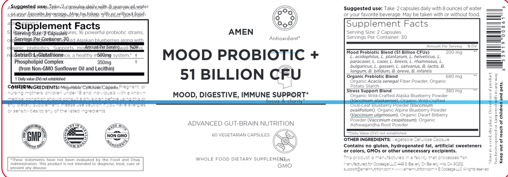 AMEN Mood Probiotic supplement is vegan, non-GMO, gluten-free, dairy-free, soy-free, manufactured in the USA in a cGMP-certified facility, and third-party tested.