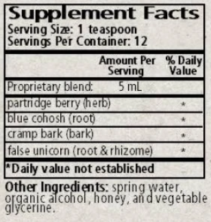 Ingredients: Partridge berry, blue cohosh, cramp bark and false unicorn in a base of mountain spring water, honey, vegetable glycerin and organic cane alcohol.