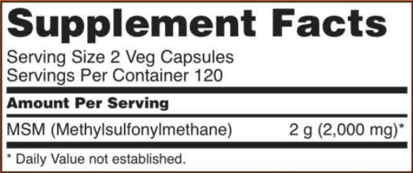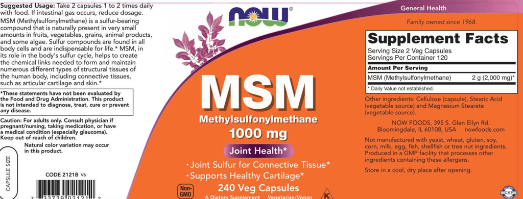 MSM (Methylsulfonylmethane) is a sulfur-bearing compound that is naturally present in very small amounts in fruits, vegetables, grains, animal products, and some algae. Sulfur compounds are found in all body cells and are indispensable for life. MSM, in its role in the body's sulfur cycle, helps to create the chemical links needed to form and maintain numerous different types of structural tissues of the human body, including connective tissues, such as articular cartilage and skin.