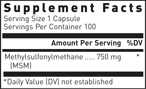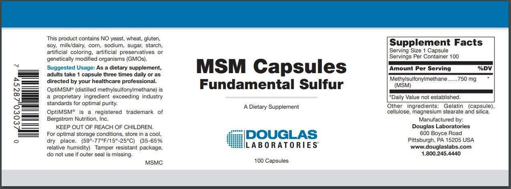 MSM (Fundamental Sulfur) provided by Douglas Laboratories®, contains 750 mg of methylsulfonylmethane (MSM) per capsule. MSM, a derivative of DMSO, is a naturally occurring compound of biologically available sulfur.