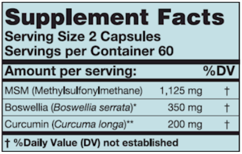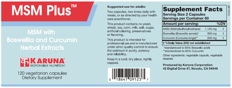 MSM Plus supports cartilage health with Methylsulfonylmethane (MSM) along with botanicals from the Ayurvedic tradition that possess immune activity-balancing properties. Boswellia serrata (Indian Frankincense), a source of boswellic acids, has traditionally been used to support the health of joints. Curcumin is a highly purified extract of Turmeric (Curcuma longa), used similarly in Central and East Asia. Both curcumin and boswellic acids support normal regulation of immune system activity by helping to balance the production of prostaglandins and leukotrienes. MSM Plus contains daily dosages of all ingredients in the amounts supported by clinical trials.