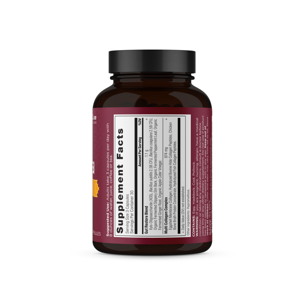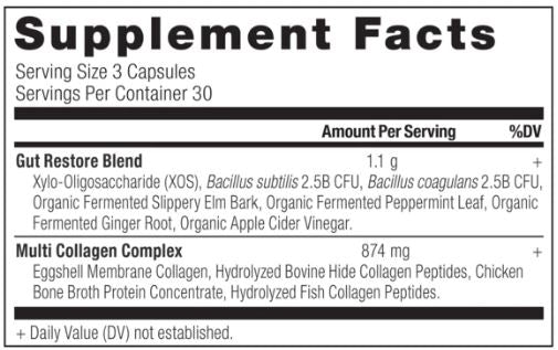 There is no other type of collagen capsule like this on the planet. Brought to you in easy-to-use, encapsulated form and powered by an ancient fermentation process that not only breaks down the collagen peptides into more absorbable forms but also helps maximize collagen support within the body. This is the most effortless way to tap into the benefits of collagen when you’re on the go, if you want to add a collagen boost to your current routine or if you simply aren’t a fan of collagen powder. Aside from a cast of gut-centric supporting ingredients, this formula may reduce collagen degradation, with noticeable results in as little as 3 days.† Why is this a big deal? Because your gut lining contains ample amounts of collagen, and joint health is commonly impacted by gut health.