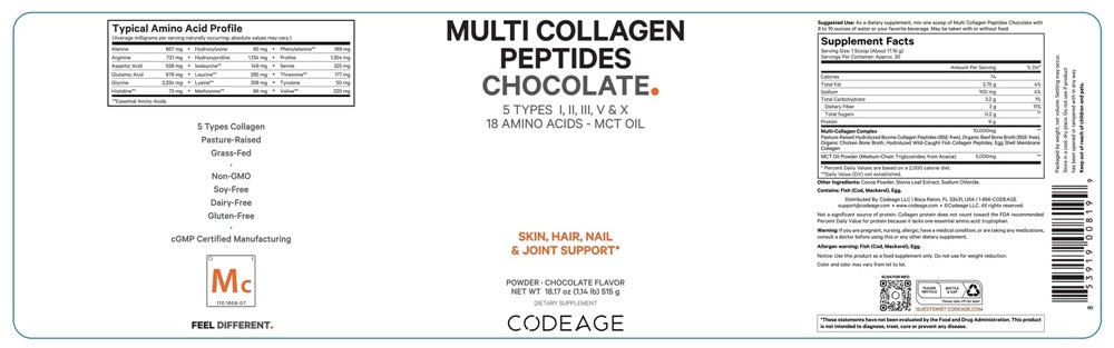 Codeage Multi Collagen Peptides Chocolate Powder offers 5 different types of collagen (type 1, 2, 3, 5 & 10) from 5 different sources. It contains grass-fed beef, free-range chicken bone broth, organic beef bone broth, wild-caught marine collagen and egg shell membrane collagen all-in-one. This formula also features MCT oil powder and 18 amino acids. It comes in a delicious chocolate flavor and is easy to mix in hot liquids. Use a shaker cup or a blender with cold liquids. This chocolate collagen supplement is a delicious way to add a collagen boost to all your drinks, protein shakes, smoothies, teas, coffees, and other beverages or treats.