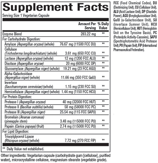 Multi Enzyme capsules are the optimal digestive aid containing a full spectrum of plant derived enzymes in a single supplement. To help improve the body’s absorption of nutrients, these valuable enzymes help break down carbohydrates, proteins and fats. This includes starch, polysaccharides, lactose and other sugars. Natural supplementation is an excellent way to replenish enzymes lost from foods during cooking and processing.