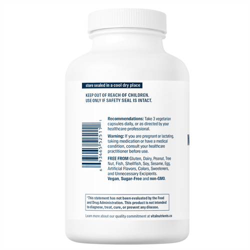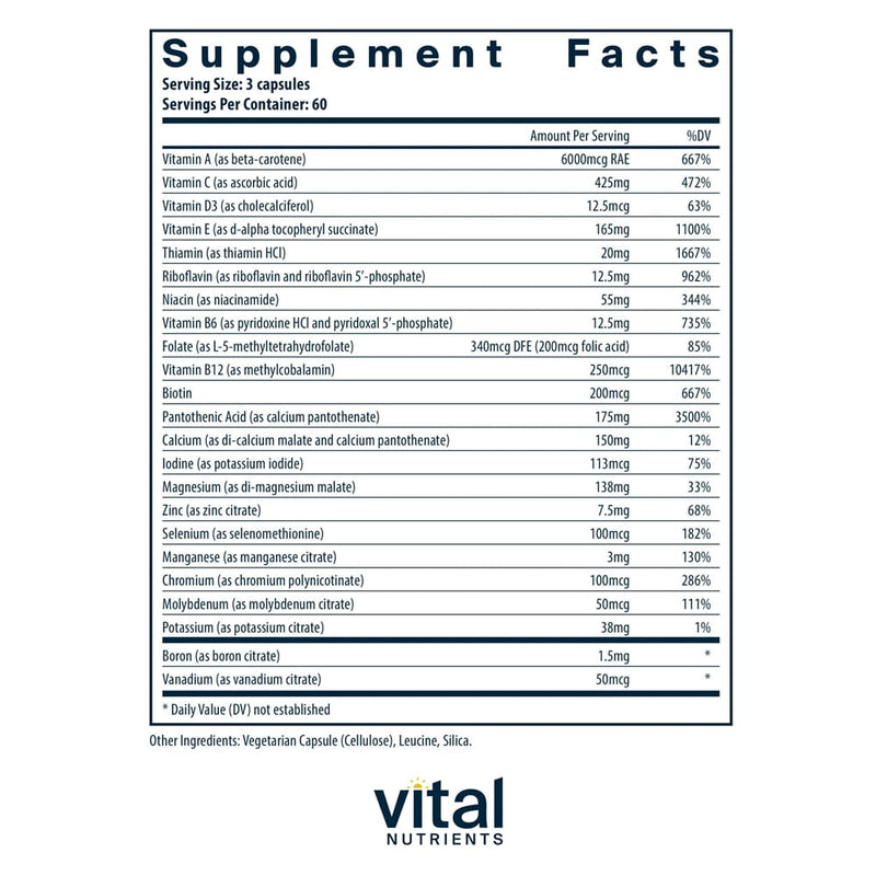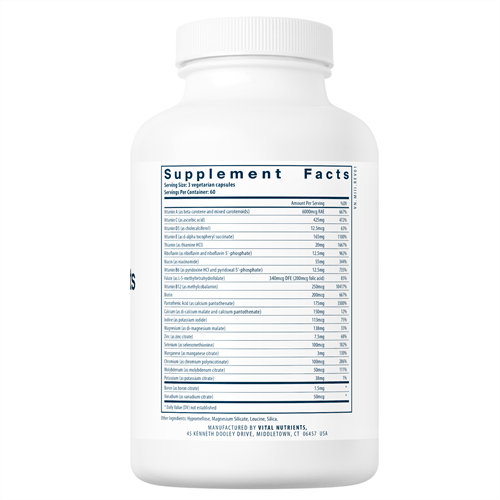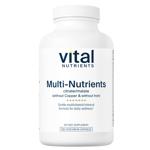 Multi-Nutrients 3 is a high potency multivitamin/mineral and trace element formula that provides the highest nutritional value for all body systems, including bone, skin, cardiovascular, liver, and immune support.* This formula incorporates premium ingredients to ensure optimal absorption and physiological activity, including folate as Metafolin® L-5-MTHF, Vitamin D3, potent antioxidants, and mineral amino acid chelates. It is a bioavailable, gentle formula that is well tolerated by most individuals. Multi-Nutrients 3 contains minerals in citrate/malate form for better absorption. This formula does not contain copper or iron.