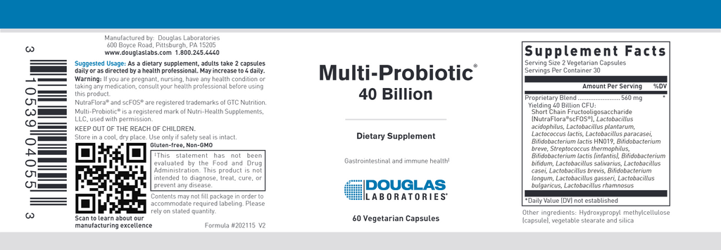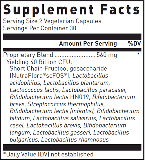Multi-Probiotic® 40 Billion contains 16 beneficial strains of Lactobacillus, Lactococus, Bifidobacterium and Streptococcus cultures, including the clinically researched Bifidobacterium lactis HN019 that supports gastrointestinal and immune function. Also included in the synbiotic blend is a short-chain FOS prebiotic fiber, which is well tolerated and works synergistically with probiotics to flourish in the intestinal tract. These probiotics are resistant to both acid and bile and undergo a patented cryoprotectant stabilization process for shelf stability.‡