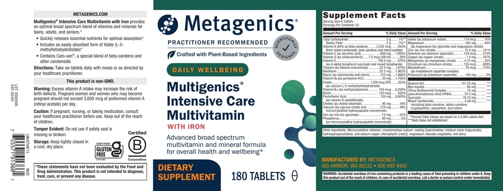 Multigenics® Intensive Care is a potent yet gentle vitamin and mineral formula that features high quality ingredients designed for optimal absorption and bioavailability. Rapid tablet disintegration allows quick release of the micronutrients. This comprehensive formula is suitable for adolescents, adults, and seniors, and features: