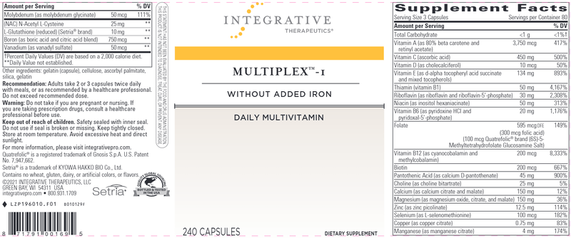 A comprehensive vitamin-mineral multiple for sensitive systems. Integrative Therapeutics Multiplex-1 Without Iron - Hypoallergenic Daily Multivitamin and Mineral Supplement - 240 Capsules.