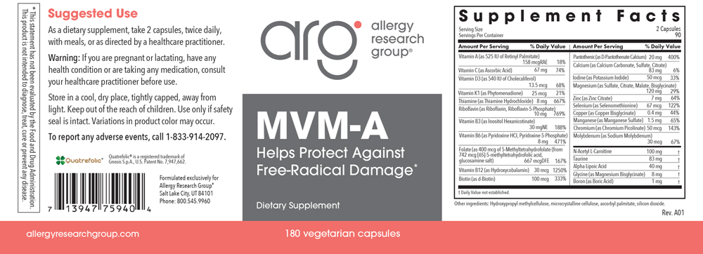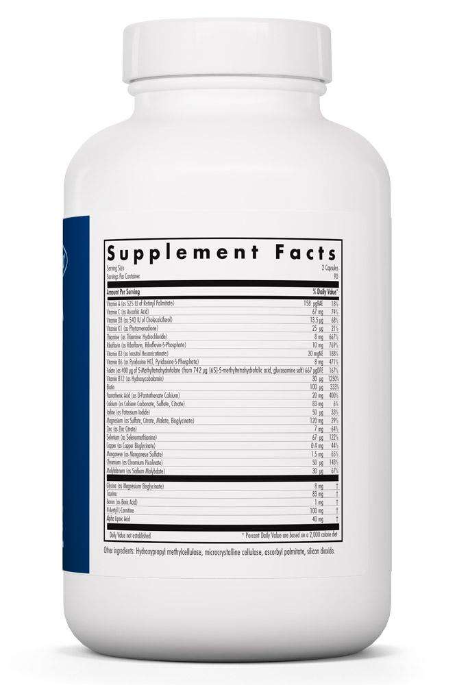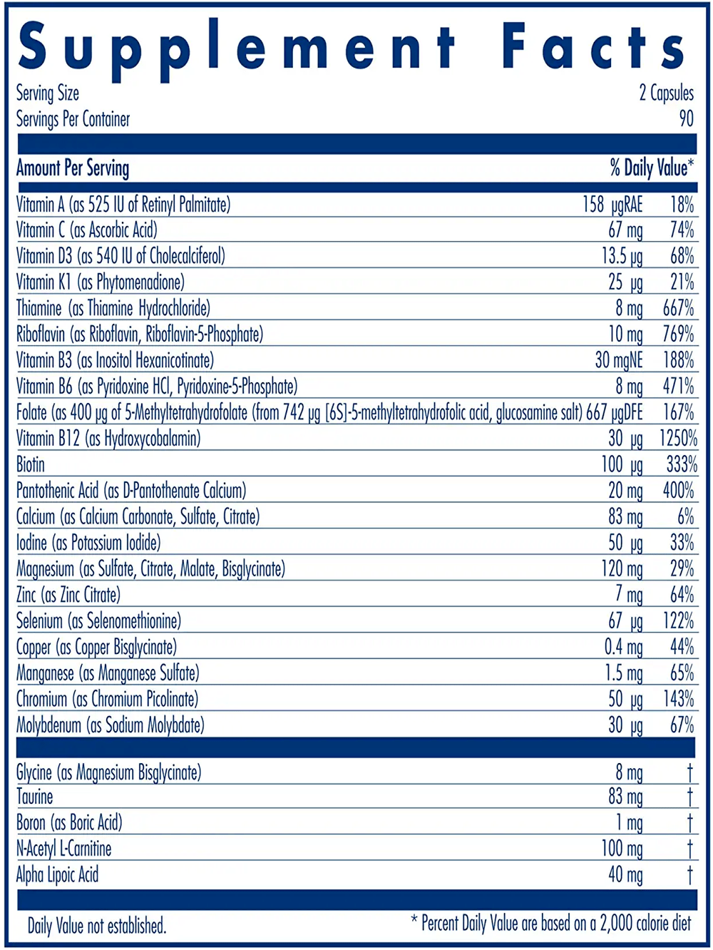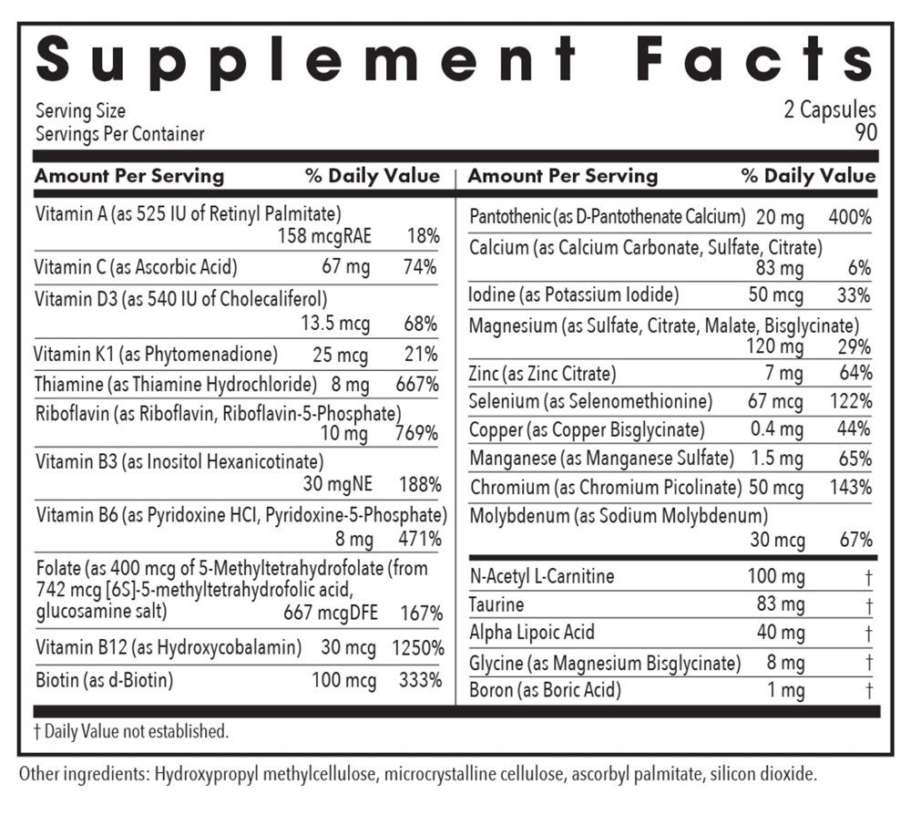Multiple vitamin and mineral formula with additional nutrients featuring N-acetyl-L-carnitine for antioxidant support, and 5-methyltetrahydrofolate, the active form of folate.* Developed by Martin Pall, Ph.D. and Allergy Research Group®.