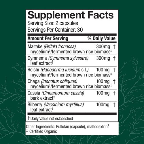 MycoBotanicals® Blood Sugar* is a blend of mushroom mycelium and herbs to help maintain blood sugar already within normal range. Blood sugar, or glucose, is regulated and balanced by our liver and is the fuel that powers our body’s cells. The blood carries glucose to every cell to create the energy that sustains life. Even those with blood sugar within the normal, healthy range may benefit from support.*