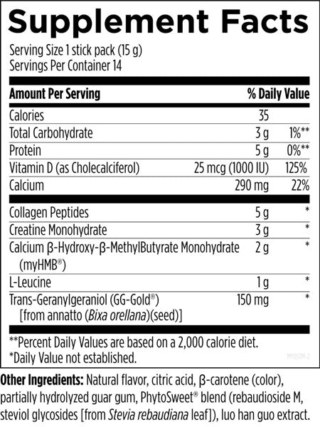 MyoStim™ offers a complete suite of muscle-supportive nutrients formulated to promote muscle tissue preservation and healthy aging.* MyoStim™ combines 15 g of collagen peptides (as BodyBalance®), 3 g of L-leucine, 2 g of HMB (as MyHMB®), 2.5 g of creatine (as Creatine MagnaPower®), 150 mg of GG (as GG-Gold™), and 25 mcg (1,000 IU) of vitamin D3 per 26 gram serving that work synergistically to help mitigate the effects of age-related muscle loss and support lean body composition.* This formula is the most comprehensive Designs for Health formula currently available that directly supports preservation of lean muscle tissue and anabolism.