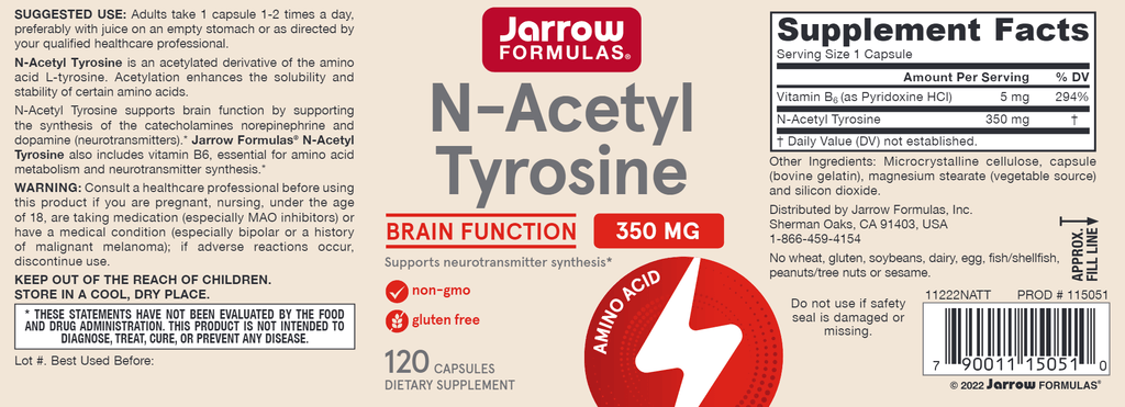 N-Acetyl Tyrosine supports brain function by supporting the synthesis of the catecholamines norepinephrine and dopamine (neurotransmitters). Vitamin B6 is essential for amino acid metabolism.