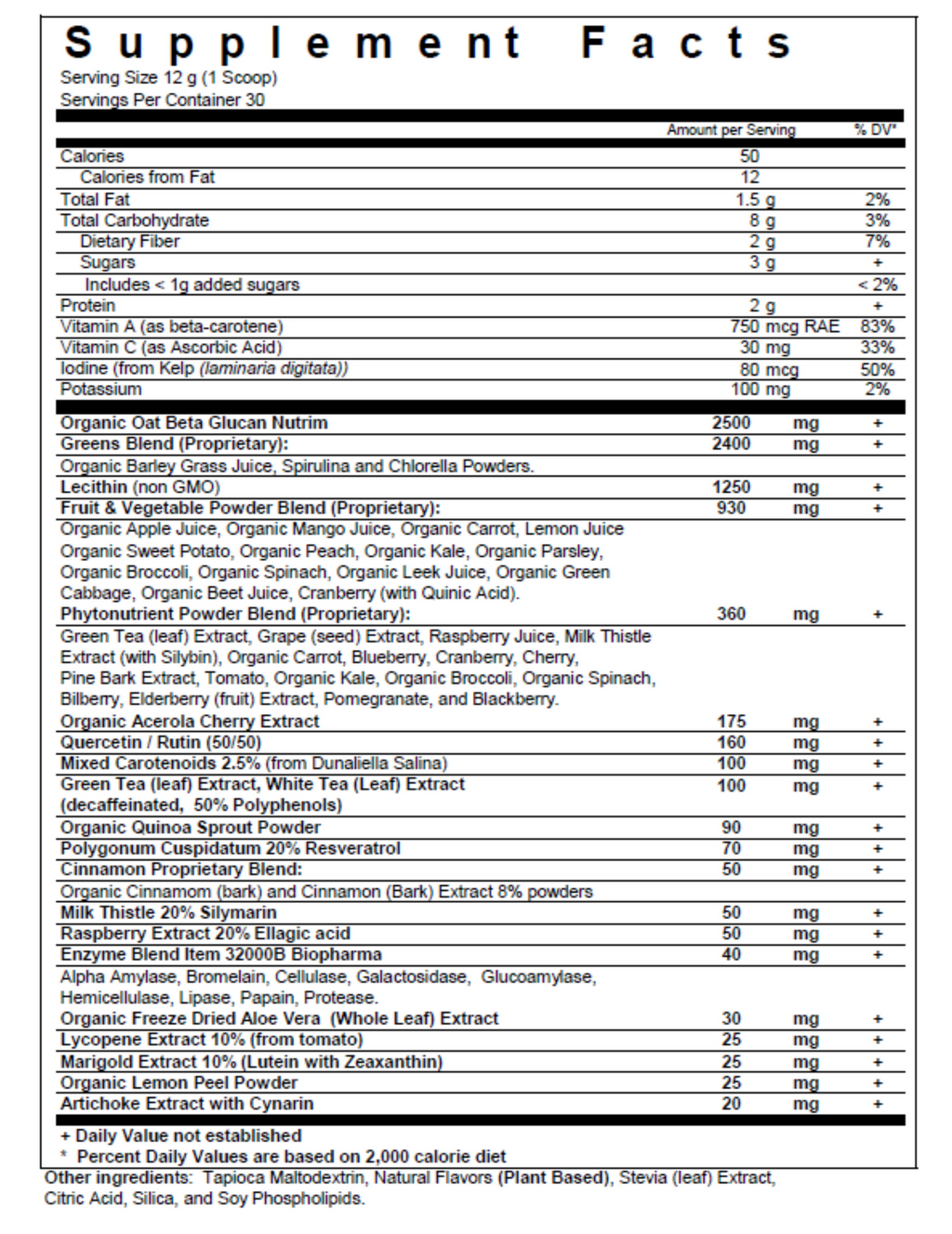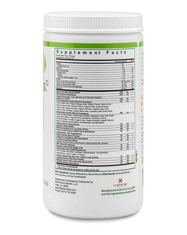 HEALTH BENEFITS: The antioxidant power of 10 servings of fruits and vegetables from 55 different ingredients. The easiest way to get your dark leafy greens to be healthy and stay healthy. This green powder supplement is truly a powerhouse of nutrition and wellness made easy. Natural Green Apple flavor. Only 50 calories per scoop.