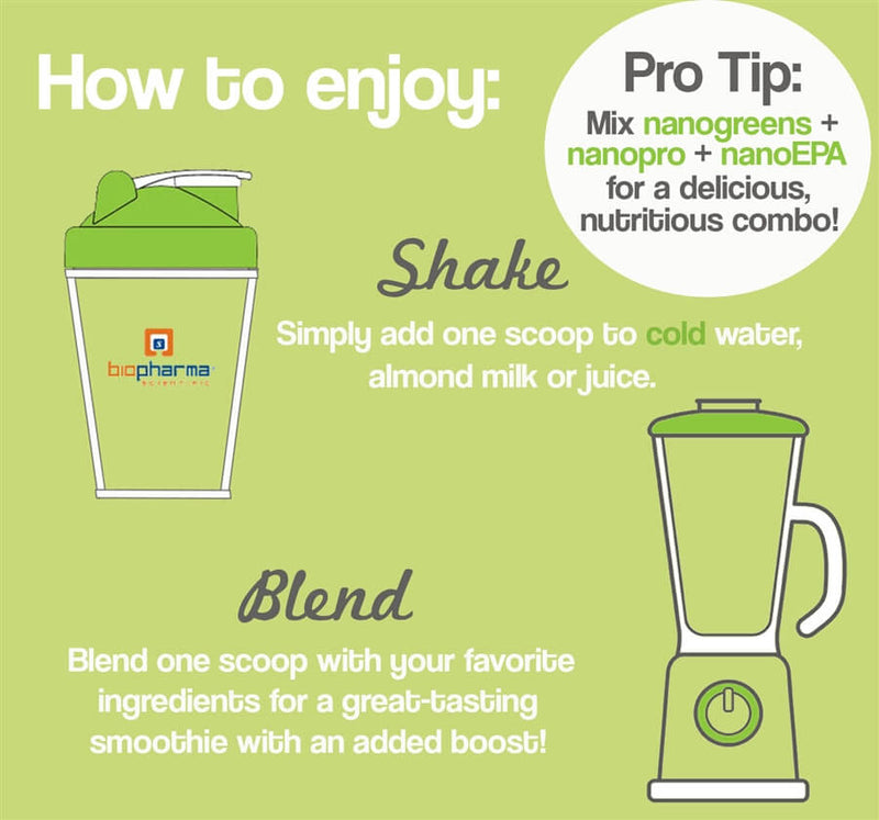 EASY TO MIX: mix one scoop of Nanogreens with 6-8 oz. of cold water. Shake briskly or blend in a blender bottle. We love to take ours first thing in the morning to alkalize, energize and give you what you need to get the day started. Try mixing with Nanopro and NanoEPA to get a nice fruity flavor. Or, try mixing with unsweetened almond milk, coconut milk or add it to a smoothie.