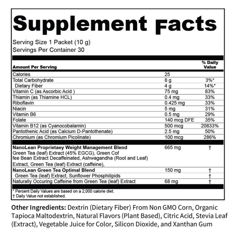 SCIENCE-BASED: Nanolean is a great natural weight management/energy drink. This product helps reduce body fat, boosts metabolism, controls stress, reduces cravings and gives you a natural energy boost. This will encourage the stomach to feel full more quickly and help you eat less! 1 serving of Nanolean provides 5 grams of fiber plus Vitamin C, Vitamin B complex and Chromium.