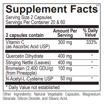 Quercetin: Quercetin has strong antioxidant activity and has been shown to support immune health by mediating the release of inflammatory compounds including leukotrienes and prostaglandins. Quercetin is known for its ability to stabilize mast cells, diminishing the release of histamine, the compound known to cause hypersensitivity reactions during seasonal changes.