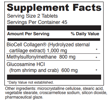 Natures Collagen™ contains BioCell Collagen II™ which is a multi-functional, patented ingredient for joint, skin, and vascular support.* BioCell Collagen II™ is made from 100% pure enzymatically hydrolyzed chicken sternum cartilage, thereby providing high bioavailability and purity. BioCell Collagen II™ naturally contains a minimum of 20% depolymerized Chondroitin Sulfate, a form of Chondroitin Sulfate that is absorbed up to 5 times better than bovinederived materials.* BioCell Collagen II™ is naturally rich in Hyaluronic Acid (10%) and Cartilage Matrix Glycoprotein (CMGP), powerful substances that support cartilage health and function as well as joint comfort.* The benefits of Natures Collagen™ with Glucosamine HCI, and Methylsulfonylmethane make this a unique, advanced, and effective formula for skin and connective tissue health.*