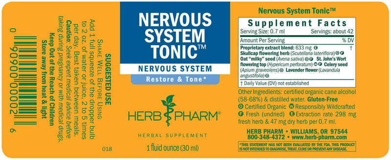 Nervous System Tonic features Skullcap extract prepared from fresh (never dried) Scutellaria lateriflora plants grown on fields we farm in southern Oregon. It also features Oat Seed extract prepared from the fresh (never dried) seed of Avena sativa grown on our own Certified Organic farms.