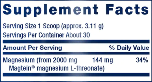 Dosage and Use: Mix one (1) scoop daily with water or juice to taste, or as recommended by a healthcare practitioner. Magnesium L-Threonate has less of a laxative effect than other forms of magnesium.