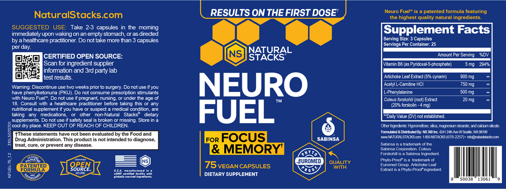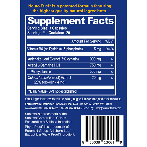 Discontinue use two weeks prior to surgery. Do not use if you have phenylketonuria (PKU). Do not consume prescription stimulants with Neuro Fuel™. Do not use if pregnant, nursing, or under the age of 18. Consult with a healthcare practitioner before taking this or any nutritional supplement if you have or suspect a medical condition, are taking any medications, or other non-Natural Stacks® dietary supplements.