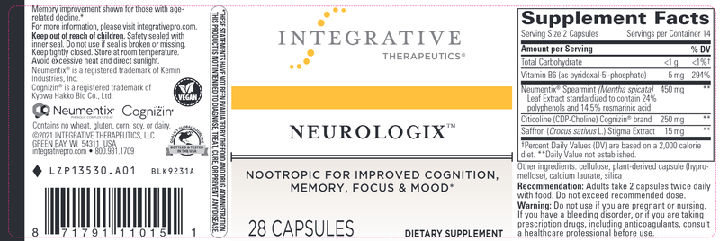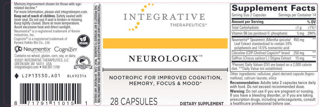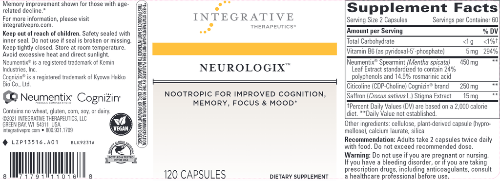 Neurologix is formulated to support cognitive processes associated with working memory and concentration, and promote neurotransmitter levels such as acetylcholine in the brain.†*