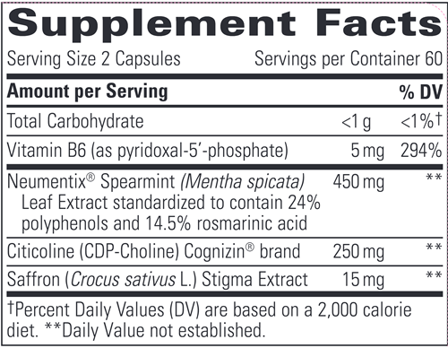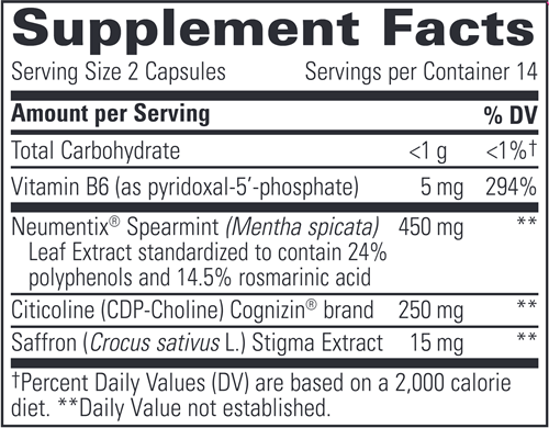 Formulated with Neumentix® spearmint extract, Cognizin® citicoline, saffron extract, and the active form of vitamin B6.