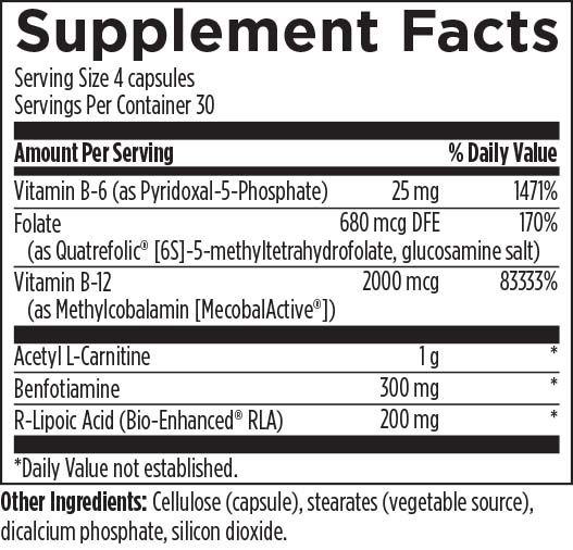 NeuroRenew™ is a comprehensive formula designed to support healthy nerve function. It contains lipoic acid and several members of the vitamin B family, including B1 (as benfotiamine), B6, B12, and folate.