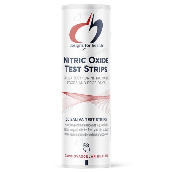 Nitric Oxide Test Strips by Designs for Health are designed to help individuals maintain optimal nitric oxide (NO) status required for cardiovascular health, immune health, athletic performance, muscular function, and healthy aging. These test strips easily and quickly monitor the two requirements needed to promote a major pathway of NO production – sufficient intake of nitrate-rich foods (such as beets, black garlic, and leafy greens) or NO-supportive supplements, and the presence of oral nitrate-reducing friendly bacteria or probiotics. Based on the results, dietary and lifestyle factors can be modified to support optimal NO production.