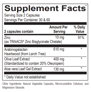 Olive Leaf Extract: Oleuropein is the unique polyphenol molecule in olive leaf extract, which has a number of health promoting benefits. The olive tree (Olea europaea) produces oleuropein abundantly in its leaves, as well as in the olive fruit itself. Special processing techniques now allow for the extraction of a stable, standardized form of oleuropein. Oleuropein is a potent antioxidant and promotes inflammatory balance. Studies have indicated that oleuropein boosts host immune defense and supports a strong immune response during seasonal and respiratory challenges. It is especially helpful for those with immune challenges related to an imbalance of bacteria in the intestines.
