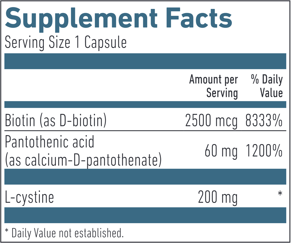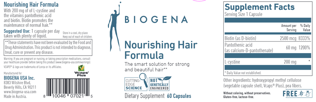Nourishing Hair Formula contains biotin in a high dosage, as well as pantothenic acid and L-cystine. L-cystine is composed of two molecules of the amino acid L-cysteine and can be found in keratin, which is the main component of hair. As a result, Nourishing Hair Formula offers a balanced spectrum of micronutrient and can actively support the fullness of hair.*