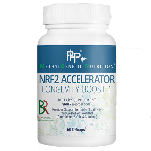 Nrf2 Accelerator (Longevity Boost 1) is designed to help support our body’s master antioxidant pathway, the Nrf2 Pathway. Activation of this pathway sets off a protective cascade of production of powerful antioxidants such as glutathione, superoxide dismutase (SOD) and catalase. Nfr2 Accelerator contains a unique blend of nutrients such as sulforaphane from BroccoRaphanin™, resveratrol and grape seed extract that help support and maintain this pathway. It can also be used to support estrogen balancing in both men and women as it contains Dong Quai and pomegranate.
