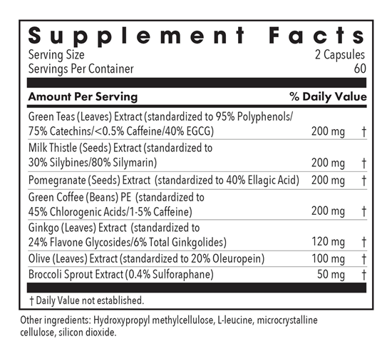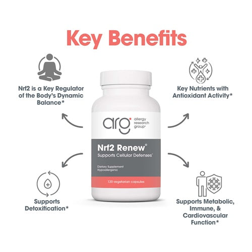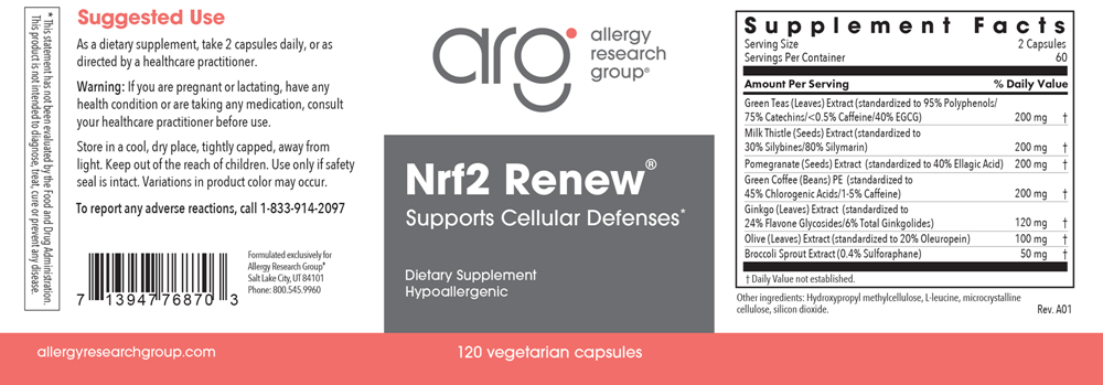 Nrf2 Renew® is a complex formula designed to activate the body's Nrf2 pathway, a unique regulator of antioxidant defense and cellular resilience.* Featuring sulforaphane, green tea, green coffee, pomegranate, olive leaf, ginkgo, and milk thistle extracts, Nrf2 Renew supports detoxification, oxidative balance, and a healthy response to environmental and metabolic stressors, promoting optimal cellular health and homeostasis.*