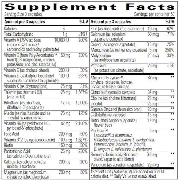 Nutrivitamin Enzyme Complex™ is an absorbable multivitamin/mineral with probiotics and microbial digestive enzymes.*
