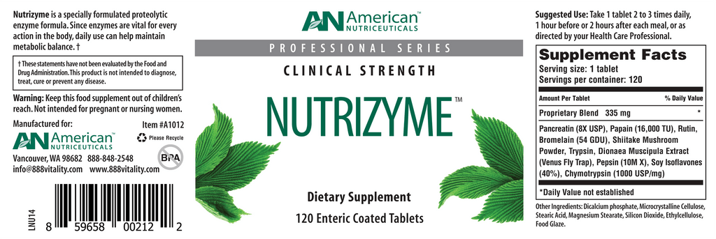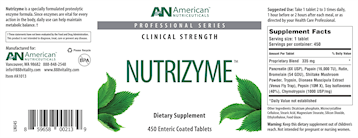 Nutrizyme is a proteolytic enzyme formula to support body function. It contains many enzymatic components and non-enzymatic components that can help with a variety of situations and body support from circulation to immunity. Nutrizyme also aids in joint health. Since Nutrizyme has a special enteric coating, this ensures its break down does not happen in the stomach but to continue to the small intestine for absorption. Enzymes are catalysts that participate in virtually every bodily process and are an important component to maintain health.