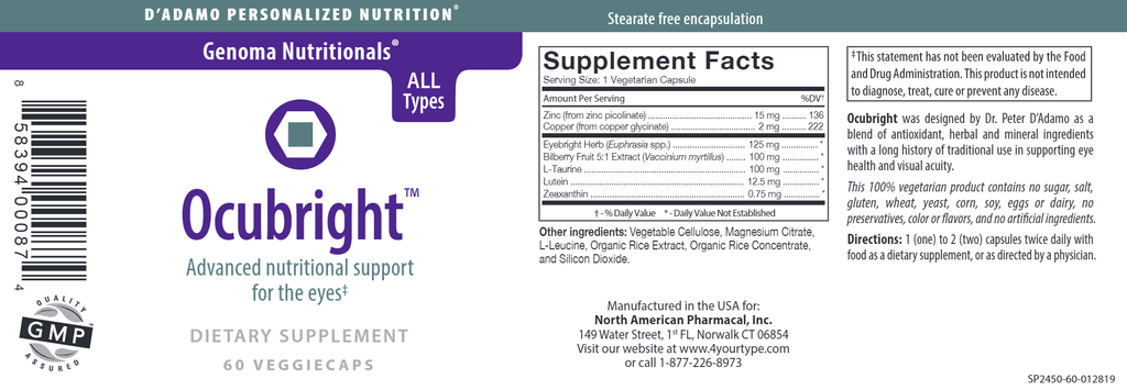 Dr. Peter D'Adamo, author of Eat Right 4 Your Type, developed Ocubright by blending together antioxidants, healing botanicals and mineral ingredients to support eye health help replenish the vital nutrients your eyes can lose as you age.*