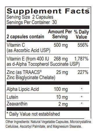 OcuView includes a unique blend of key nutrients shown to support healthy eye function and maintain the long-term health of the eyes. The OcuView formula provides 500 mg vitamin C, 400 IU of vitamin E, 25 mg of zinc bisglycinate chelate, 100 mg alpha lipoic acid, 10 mg lutein and 2 mg zeaxanthin for comprehensive support.