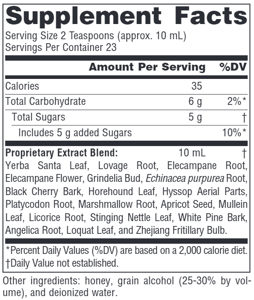 Soothing wild cherry bark is well-known for respiratory support in winter. It is combined with additional North American classic herbs such as elecampane, horehound, hyssop, and mullein.