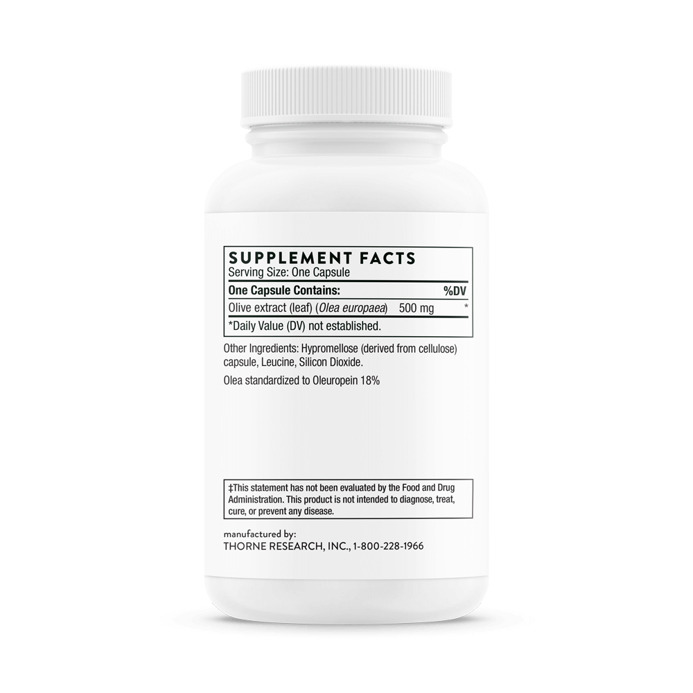 Thorne's Olive Leaf Extract contains 18-percent oleuropeins, compounds that have demonstrated antioxidant and immune-enhancing properties.* In addition, extracts from olive leaf can help maintain a healthy balance of cytokines in the body.* Cytokines are proteins secreted by cells of the immune system that act as chemical messengers, helping to regulate the body's immune response and inflammatory response. Evidence suggests that olive leaf extract is beneficial for dilating coronary blood vessels, thus supporting blood flow to the heart and helping to maintain already normal blood pressure and cardiac rhythm.*