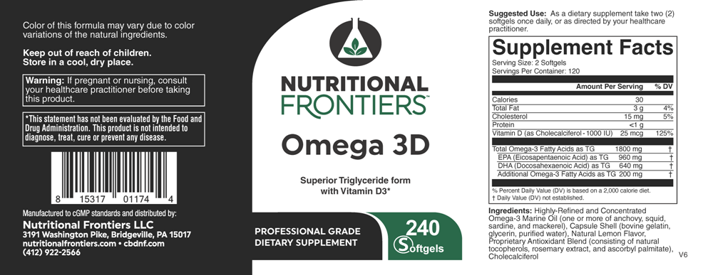 OMEGA 3D is a blend of non- GMO natural oils from Fish that combines the health benefits of Omega 3 and Vitamin D3. It is a comprehensive “multi” fatty acid supplement that is rich in EPA, DHA and Vitamin D3.