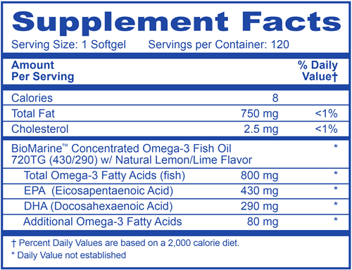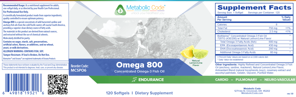 Omega 800 is a concentrated, purified source of pharmaceutical-grade omega-3 fatty acids from wild and sustainably harvested sardine and anchovy fish oils from the cold Pacific waters off coastal S . America. Omega 800 is from natural sources, extracted without the use of chemical solvents, then molecularly distilled for optimal purity and stabilized with natural antioxidants. Omega-800 is flavored with natural lemon/lime. Each capsule provides 430mg EPA and 290mg DHA. Omega 800 is a TRIAD 2 Immune/ Brain and TRIAD 3 cardiovascular supportive supplement.