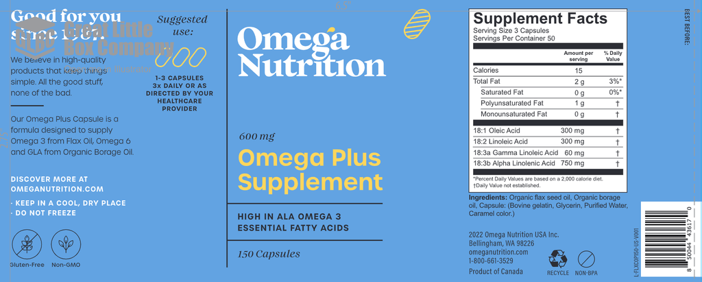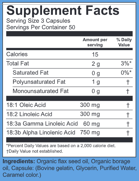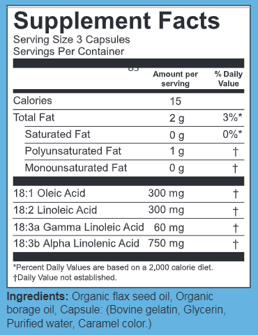 Omega Nutrition's capsules contain our cold pressed Flax Seed Oil & Borage oil rich in ALA (alpha-linolenic acid) Omega 3 fatty acids and GLA (gamma-linolenic acid).