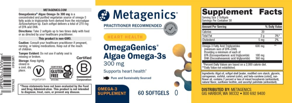 OmegaGenics® Algae Omega-3s 300 mg features a concentrated, purified vegetarian source of omega-3 fatty acids in triglyceride form from the microalgae Schizochytrium sp. Each softgel provides 300 mg EPA and DHA.