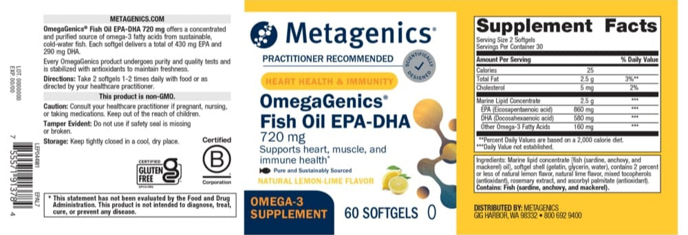 OmegaGenics® Fish Oil EPA-DHA 720 mg is a high-quality, multi-benefit fish oil. Each serving provides 430 mg of EPA and 290 mg of DHA from naturally sourced 100% wild-caught fish. Rigorously tested for 200 contaminants including heavy metals, enviornmental toxins, & plasticizers from microplastics.