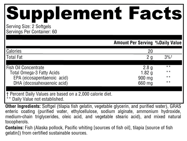 OmegaPure 780 EC™ is International Fish Oil Standards (IFOS) five-star certified, which assures the highest level of purity, stability, and potency in fish oils. Each fish-gelatin–based softgel provides 780 mg of EPA and DHA. The softgels are covered with a GRAS-certified enteric coating so that they are easy to swallow and the EPA/DHA content is optimally absorbed. EPA and DHA from fish oil promote wellness by supporting cardiovascular health, cytokine balance, joint health, and brain and nervous system function.*
