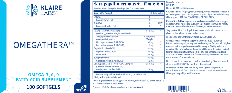 This mixed fatty acid supplement supplies important fatty acids that are often difficult to obtain from the diet. OmegaThera was formulated to favor omega-3 fatty acids over omega-6 fatty acids to help maintain a healthy fatty acid ratio when added to typical diets that tend to be too low in omega-3.