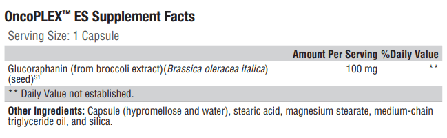 TrueBroc® broccoli seed extract is obtained using a patented process to extract glucoraphanin (also known as sulforaphane glucosinolate or “sgs”) from its most concentrated cruciferous source—broccoli seeds. Glucoraphanin is enzymatically converted to the extensively researched isothiocyanate known as sulforaphane (SFN). Research suggests that SFN supports long-lasting antioxidant activity and the production of detoxification enzymes. It also extends support to the immune, nervous, and cardiovascular systems, addressing the maintenance of good health throughout adult life. OncoPLEX ES™ provides 100 mg of glucoraphanin per capsule.*