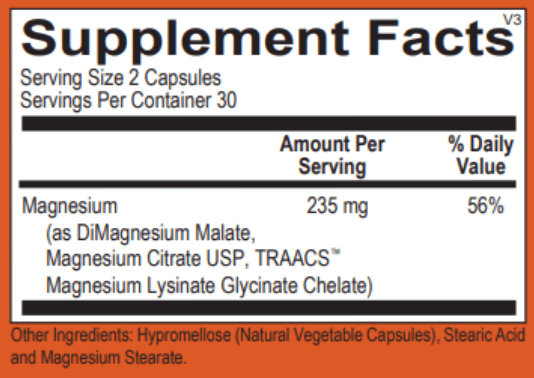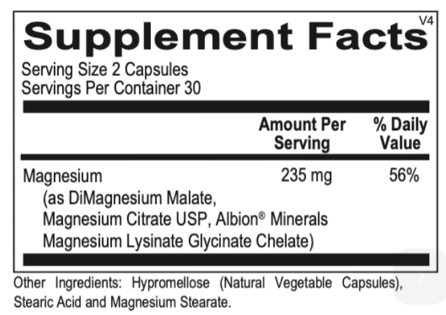 This reacted magnesium takes advantage of three unique pathways of absorption by providing magnesium as di-magnesium malate, magnesium citrate, and magnesium lysinate glycinate for enhanced absorption, improved utilization, and gastrointestinal (GI) comfort.