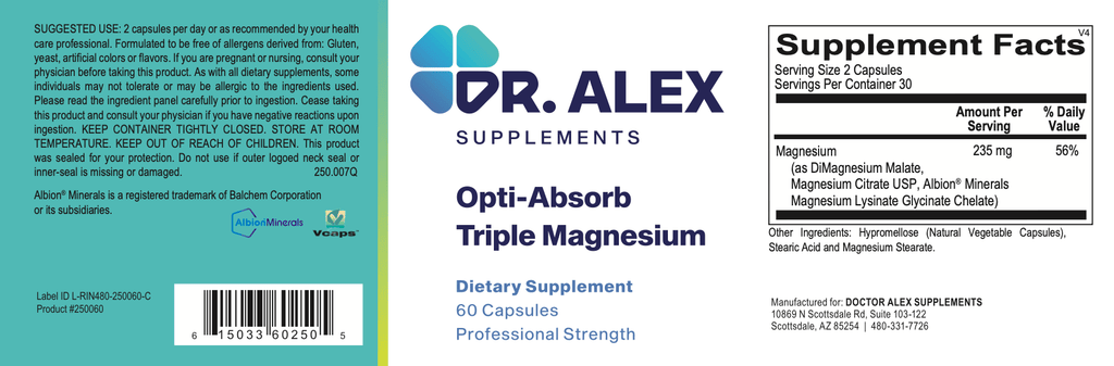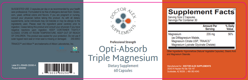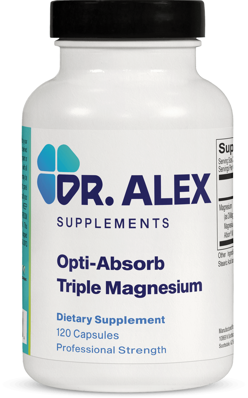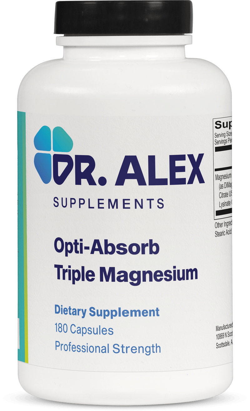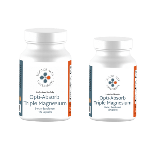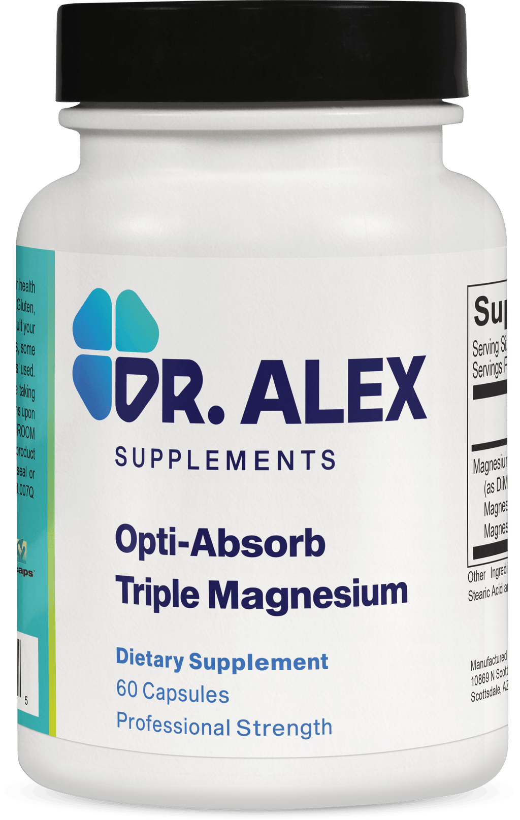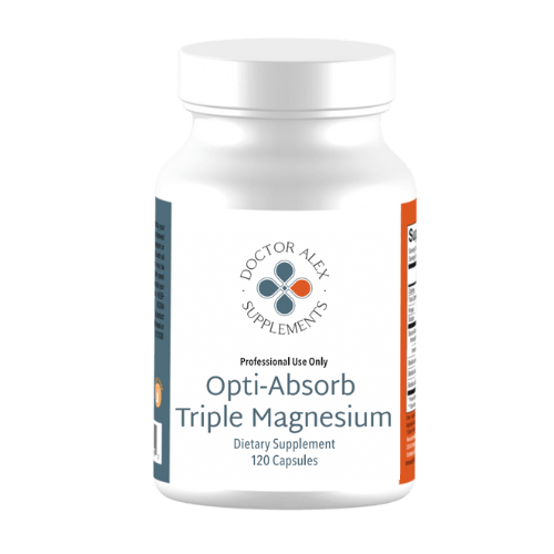Opti-Absorb Triple Magnesium includes three forms of highly absorbed magnesium for a variety of protocols. Contains magnesium malate, citrate, and lysinate glycinate.